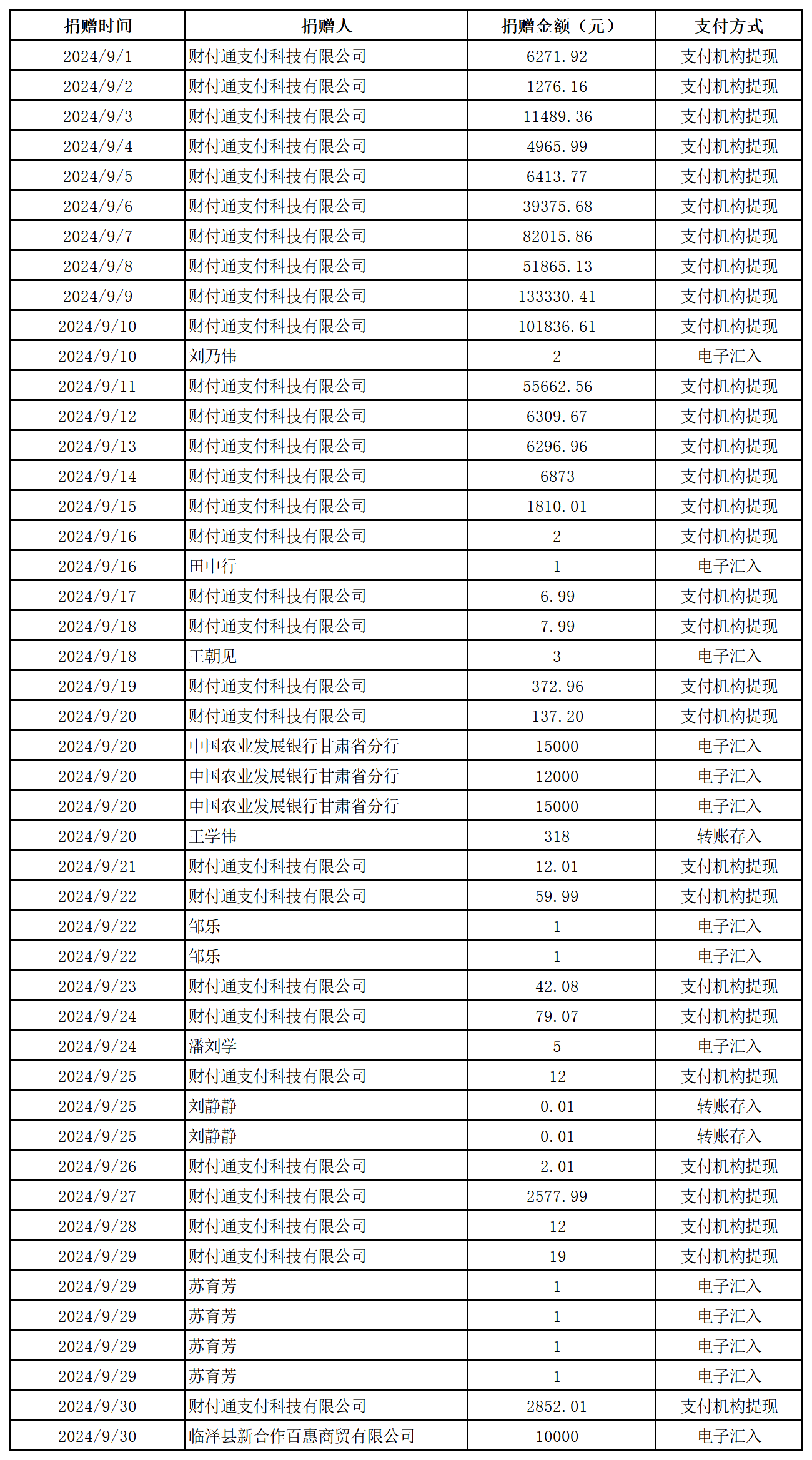 2024年張掖市慈善協(xié)會積極搭建愛心平臺,得到廣大愛心人士和愛心單位積極響應(yīng),踴躍捐款捐物,現(xiàn)將(2024年9月1日--9月30日)接收到的銀行轉(zhuǎn)賬收入公示如下: